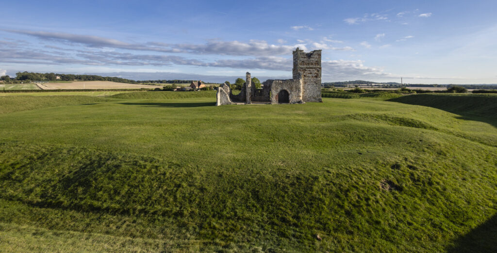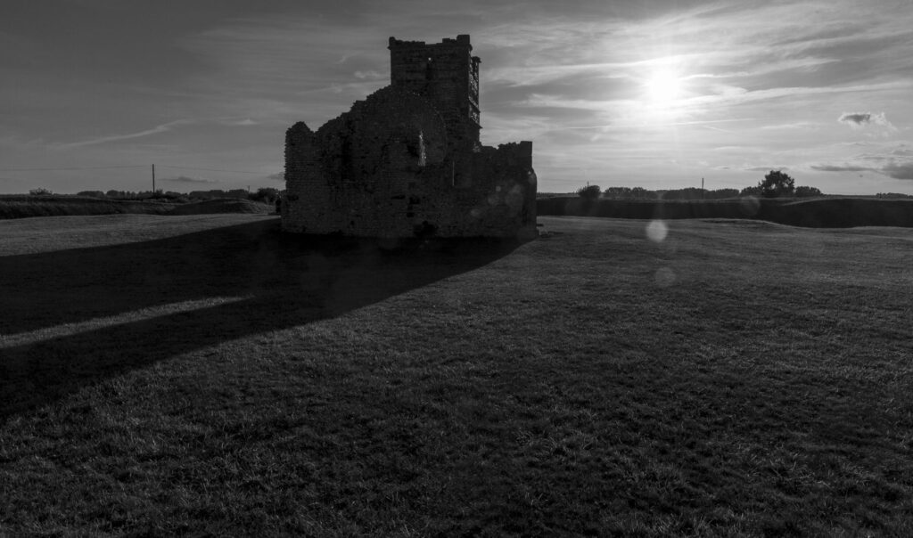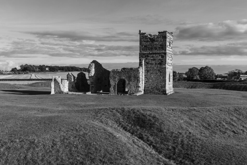 Walking around the mound gave me beautiful views of the rural farmland surrounding the site, the fields full of hay bales, and a couple of light aircraft swooping across the sky. I later read that the surrounding fields also contain some sections of the earthworks, but I did not know this then, and so did nothing about it. The view of the church ruins from the mound is fantastic. It resides in the centre of the hollow of the earthworks, with the setting sun casting sharp shadows across the enclosure making for a very dramatic view. At any moment, I was expecting a sadness of goths to come meandering across the scene, humming Fad Gadget songs.