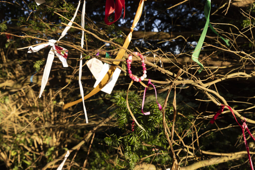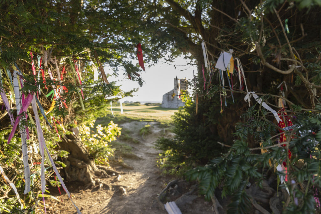 Church explored (walked through a few. times) I made a final circuit of the earthworks and in doing so discovered the little tunnel between the Yew Trees at the back of the site. I ducked into the tunnel to find it full of handwritten notes, ribbons and other tokens. On reading up later, I found it’s been nominated as a wishing tree by the local community, which seems somewhat strange given its remote location. It was a weird and touching moment discovering this hidden, unassuming place beneath the trees, full of people’s hopes and wishes.